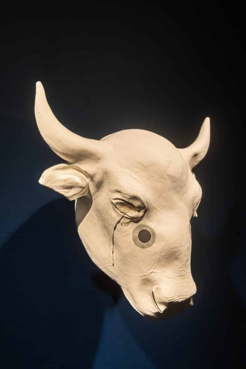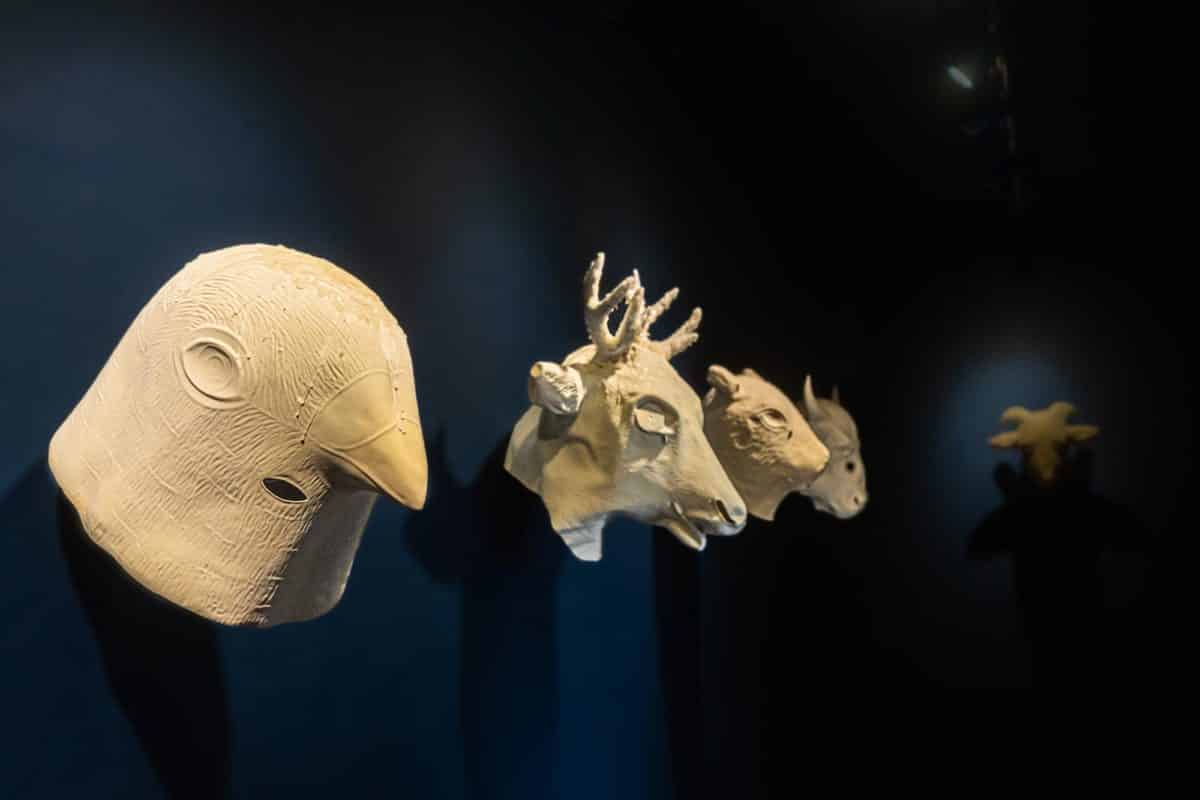 Cinq masques, semblables à des têtes-trophées d’animaux, réalisés en latex et en cire, se situent dans un entre-deux, à la frontière de l’organique et de l’artificiel. Le latex évoque la peau et la chair, quelque chose de vivant mais factice. Les masques sont retournés sur eux-mêmes : creux et bosses s’inversent comme dans un moulage, accentuant leur caractère étrange.