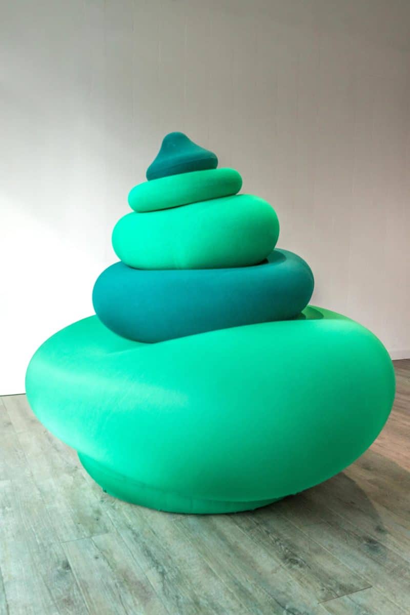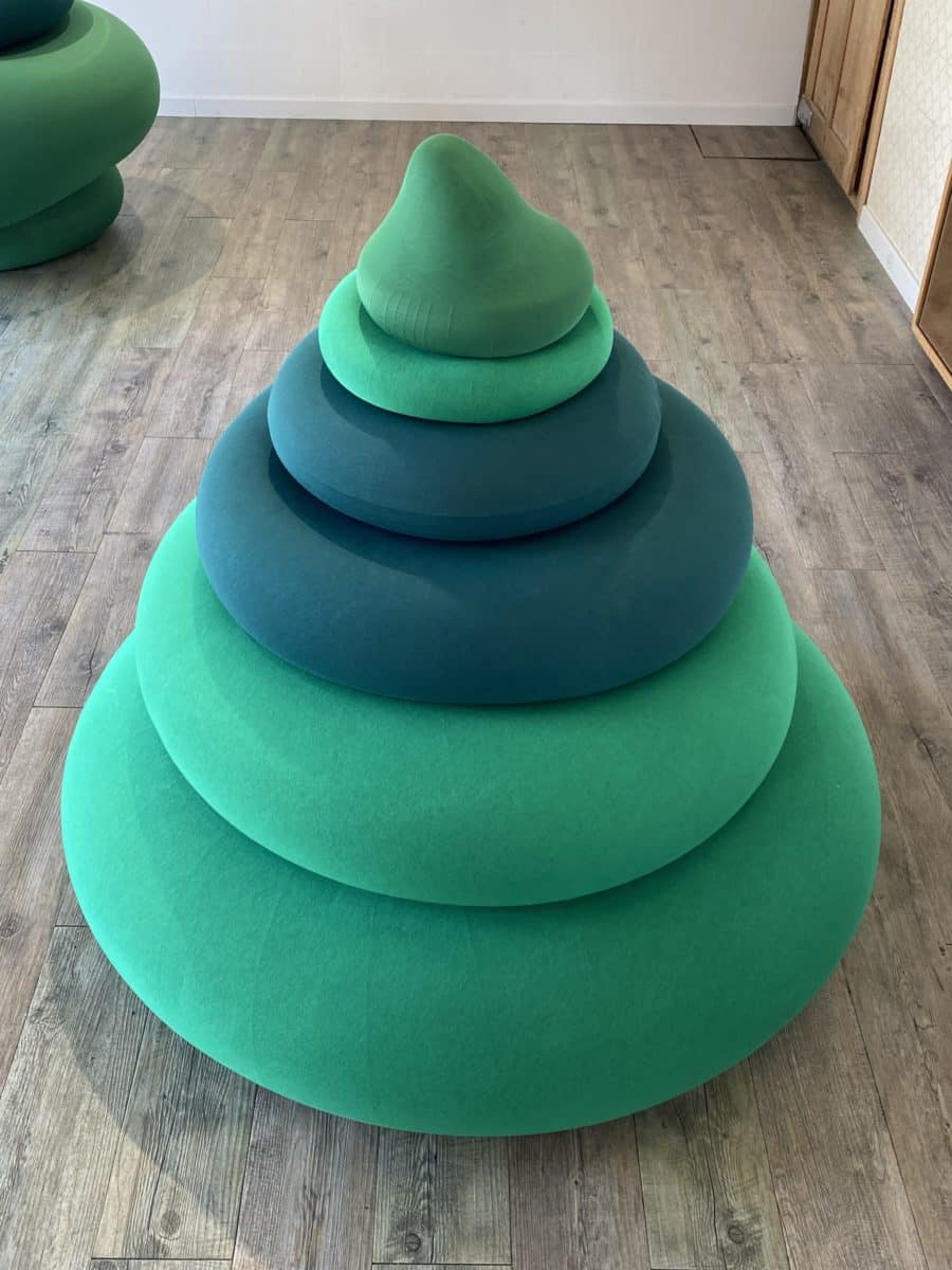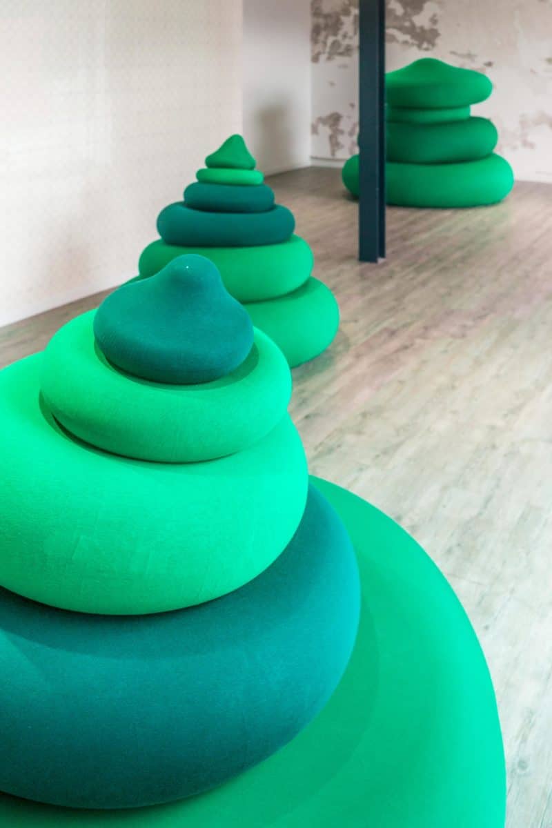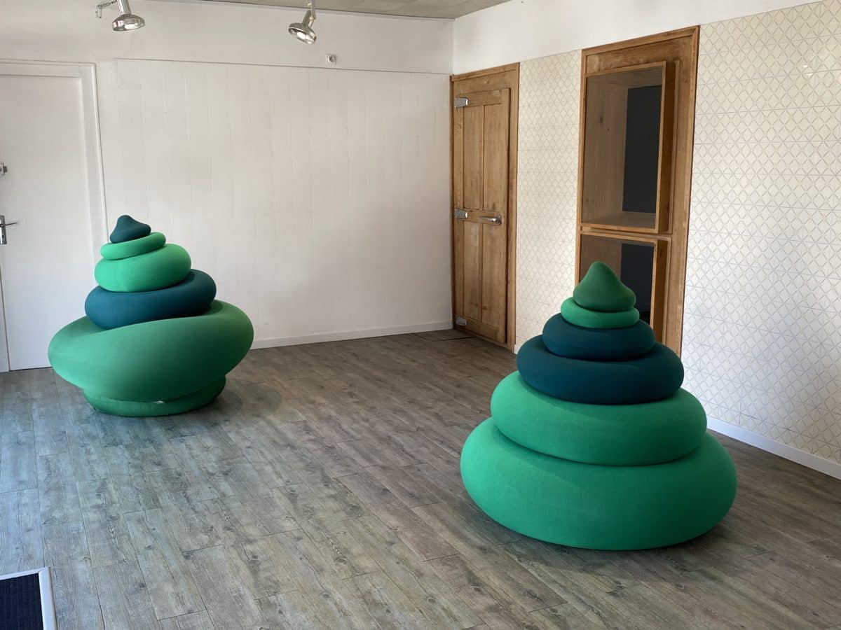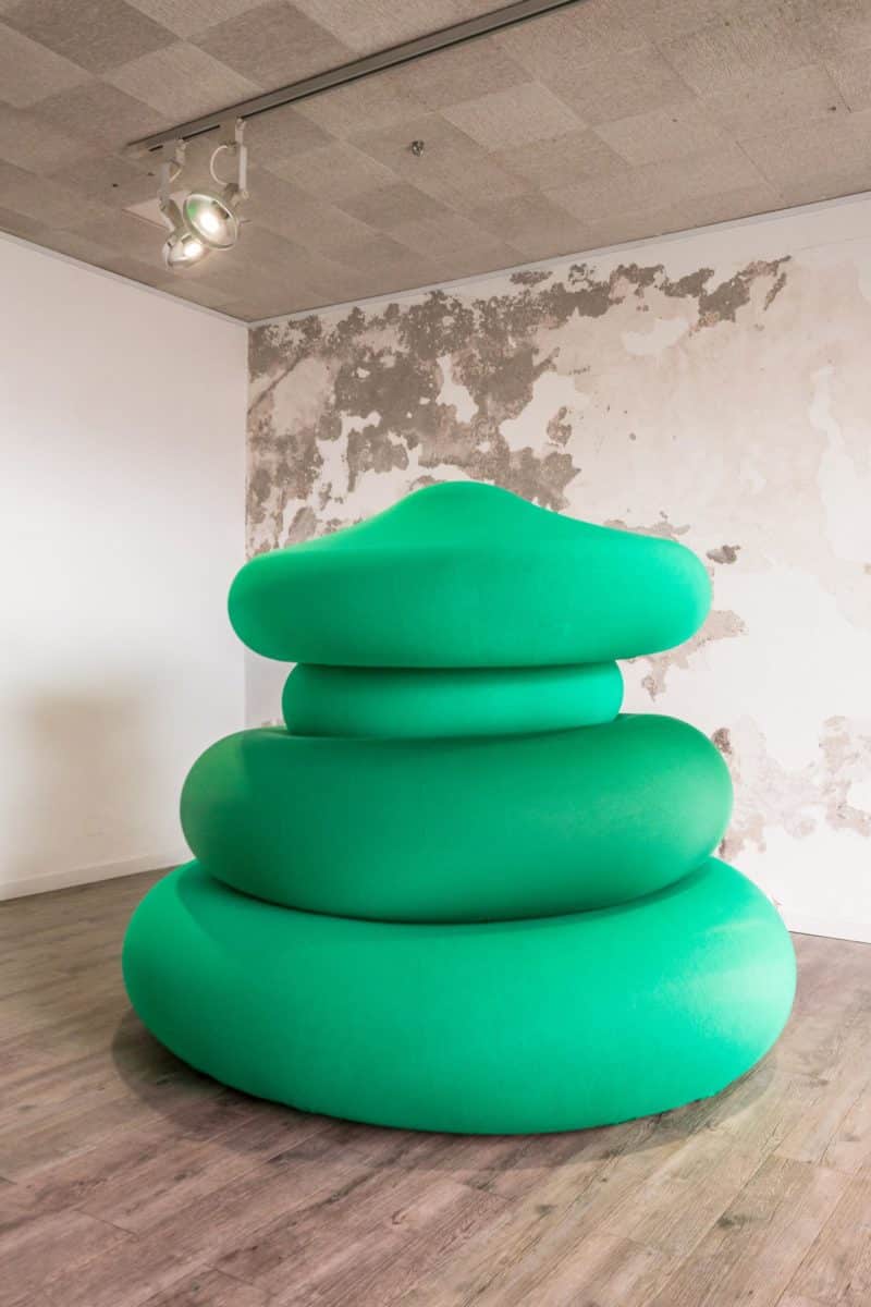 Trois grandes sculptures gonflables, aux teintes allant du sapin au haricot, occupent l’espace. Leurs formes rondes, empilées, rappellent à la fois des reliefs naturels, des montagnes adoucies par le temps ou des masses végétales issues d’une forêt imaginaire. Elles instaurent un paysage artificiel mais accueillant, invitant le visiteur à la déambulation. Le corps est sollicité : il circule, s’approche, contourne, se confronte à ces volumes souples. La rencontre est physique autant que mentale. L’échelle des sculptures modifie la perception du lieu et crée une sensation d’immersion, comme si l’on entrait dans un espace suspendu, hors du quotidien. Entre nature évoquée et matière synthétique, entre jeu et étrangeté, l’installation fait appel à l’imaginaire du spectateur. Elle propose un territoire à explorer, un lieu sans fonction définie, où chacun peut projeter ses propres images — celles de la montagne, de la forêt, ou d’un paysage intérieur.